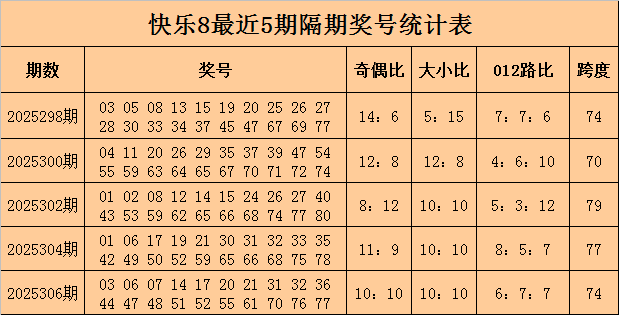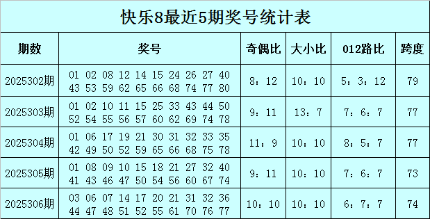 福彩快乐8第2025306期开奖回顾:03 06 07 14 17 20 21 31 32 36 44 47 48 51 52 55 61 70 76 77,其中奖号奇偶比开出10:10,大小比开出10:10,012路比开出6:7:7,和值为768,跨度为74。