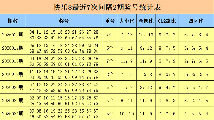 冷温热码分析:在快乐8分析中,我们一般把遗漏0-2期的号码称为热码,遗漏3-6期的号码称为温码,遗漏6期以上的号码称为冷码,最近7期奖号冷温热码出现个数比为16:42:82,连续7期冷温热码理论个数比为19:39:82,上期奖号冷温热码个数比为,6:4:10,当期理论冷温热码个数比为3:5:12,目前冷码有7个,温码有29个,热码有44个,本期看好热码表现活跃,关注冷温热码比2:3:15。