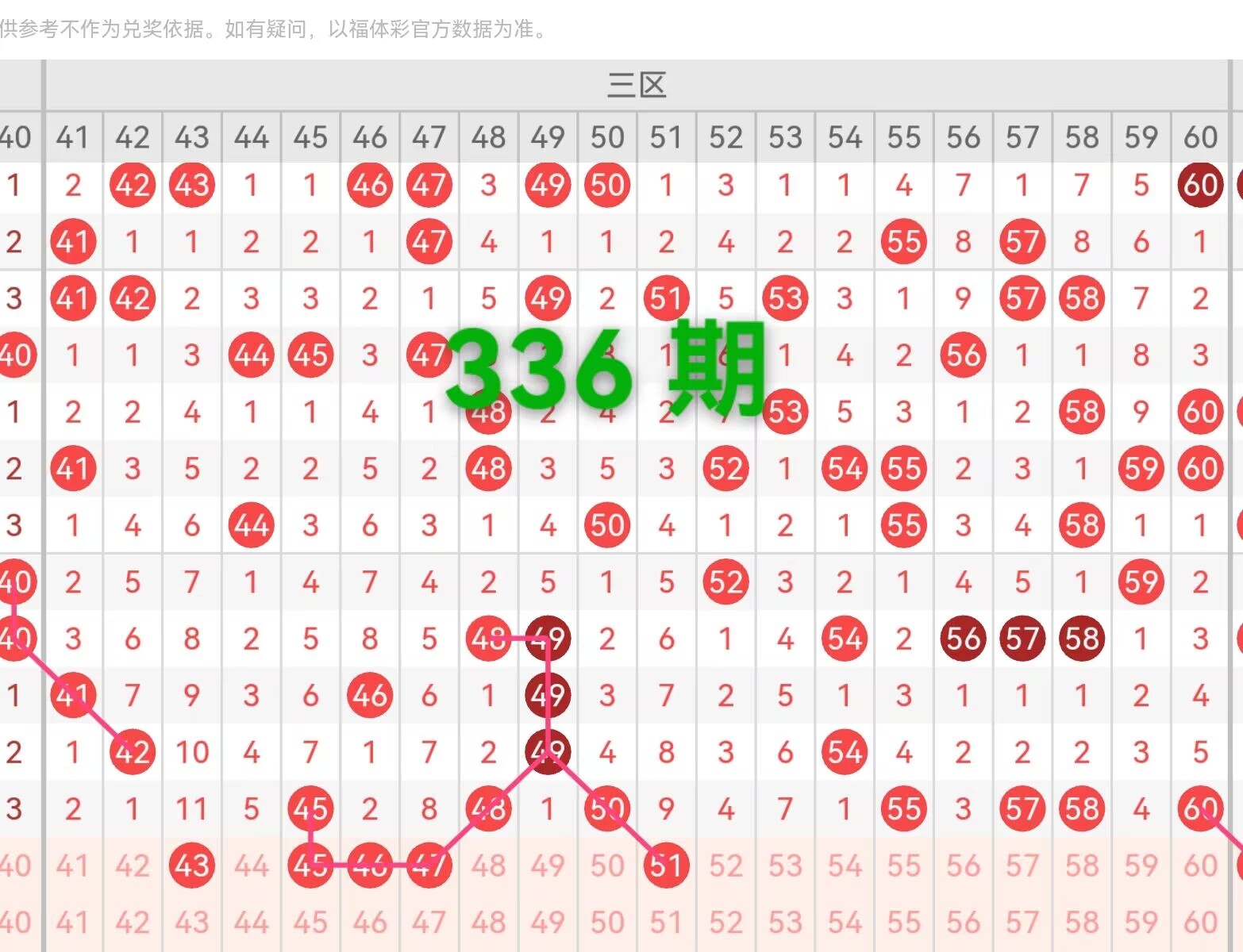 41-60号区间25335期开出7码,出号热度回升,本期预计出6个,本区间作为1路核心爆发区,需重点关注。43号为1路冷码,遗漏11期,43号作为1路中段关键码,热势支撑,且本区间近10期连号出现率较高,43号与44号形成连号的概率极高,契合连号集中规律 。45号作为上期开出的0路热号,属于热号连出候选,0路本期走热,45号作为中段0路码,既契合回补逻辑,又能平衡区间奇偶分布。46号为1路冷码,遗漏2期,分布均匀,1路偶数号码近期走势较热,46号作为偶数1路码,可填补本区间1路偶数的出号空白,且邻号45上期热出,带动效应明显。47号为2路冷码,遗漏8期,具备独立回补,冷码属性叠加高热度尾数。51号为0路冷码,遗漏9期,51号作为后段0路码,可填补50-60之间的出号空白,且0路本期预计走热,51号作为高遗漏冷码,回补确定性极高。
