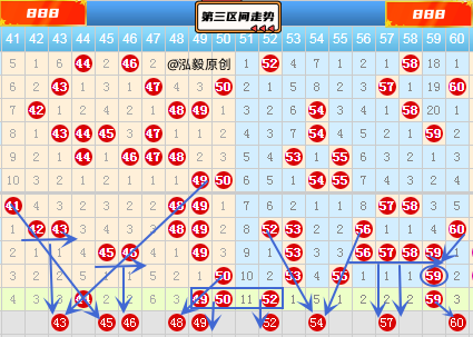 该区间上期开出44号数字,本期我们可以注意一下它出重号可能性,其次就是可以防守一下33号,它俩前后出的机会号是比较大的。该区间的49 50 52形成了连号空一带号类型,本期只有这一组,那么落重号的机会就比较大了,所以我们要重点分析。连号56 57 58 59在前两期都落了59号,那么本期我们可以主看56 57 58号的落号了,预计会有一个号码落下来看。