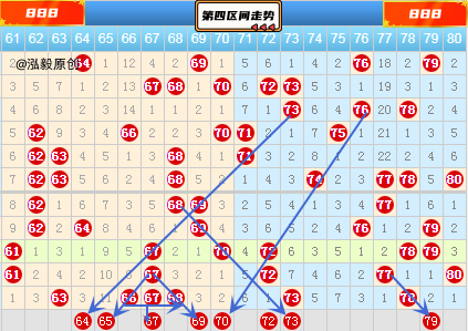 该区间的64 65号是属于空二中间数,本期的空二类型只有两组,那么我们作战的时候就要小心了,有可能空二中间数会全断号,当然按照正常标准来说,有一组空二中间数是要有号开出来的,需要防守,但是做胆就有点风险了。上期开出的3连号66 67 68号,本期应该也是会落一个号码下来的,我们可以做一下防守。在71-80号数字区间,73 76 78 80这个组合号码已经走了一个轮回了,本期预计会断号,我们可以停一期看看,当然防守是有必要的。