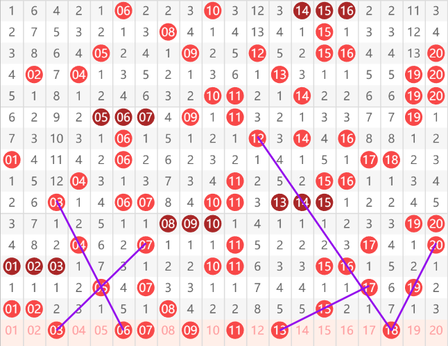 快乐8第2025295期01-20区域,我们看到03号具备一个从07间隔一期出05,再间隔一期出03的间隔一走势。以及我们看到03间隔一出04再间隔一出05,再间隔一出06的间隔斜连。然后十三号的间隔一斜连以及十八号我们看到的12间隔两期出14再间隔两期出16,再间隔两期出18的间隔二斜连,以及20到19到18的间隔一斜连。这个区域推荐的号码比较多,大家自由选择。具体的请根据个人思路进行选择