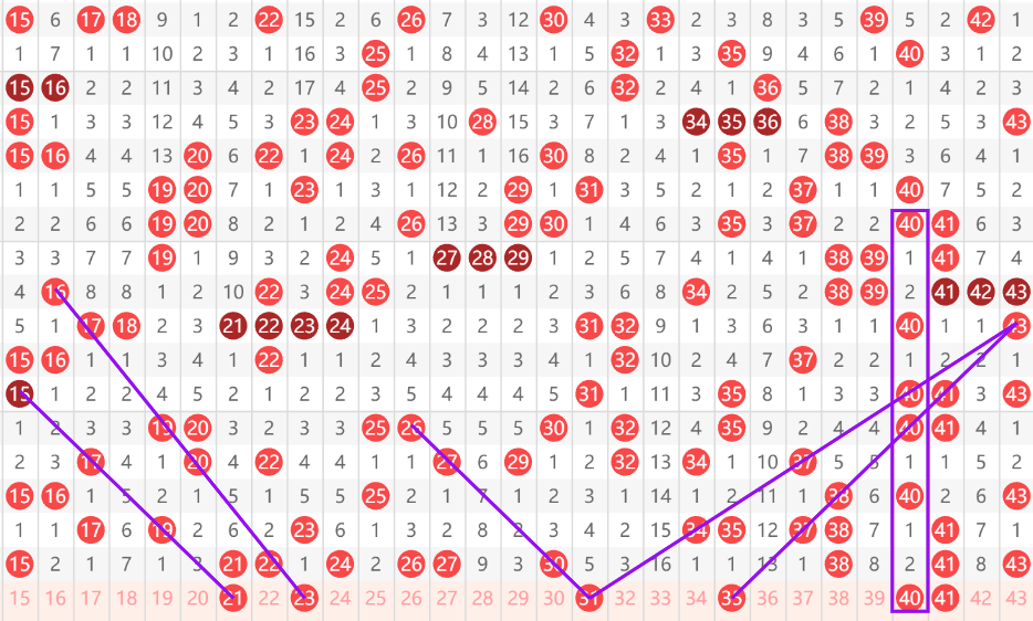 快乐8第2025294期20~40区域,这个区域的号码首先看到了一个21号,它是一个间隔一的四斜连。然后是23号的一个梅花号,包括他从16走过来的一个间隔二斜连。然后是31号,我们看到有一个大斜连,35号,有一个大鞋连40号,是个上下对等的号码。所以这个地区推荐的号码差不多有5个号。个人看好的是21和31,具体的大家根据自己的思路选择。