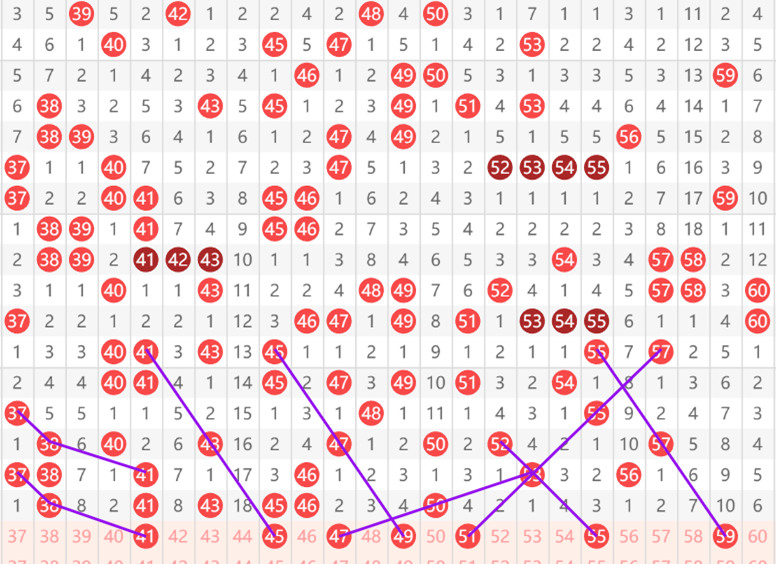 快乐8第2025294期41-60区域的推荐如上图,这个区域首先看到的是41号上下对称的,上面是3重,隔两期给了两重,那么隔两期再给三重带上40是一个很不错的号码,下来是45号的一个斜连走势。这个地方推荐带上44和45一起开出,然后47号我们看到了一个斜连,49号也是一个斜连号码。然后51号我们看到从57、55、53~51的间隔一些连以及59号的斜连,所以这个区域的号码基本上以斜连号码为主。具体请根据个人思路选择。