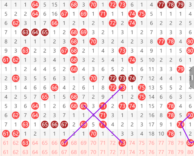 快乐8第2025294期61-80区域的推荐如上图,这个区域的号码,推荐的比较少,第一个我们看到的是63号的间隔对称走势。然后是67号,我们看到从73间隔一出71,再间隔一出69,再间隔一出67的走势。然后就是73号的一个间隔走势,包括最后的80一个间隔对称走势。这是本期推荐给大家所有的号码,包括上面的所有的号码,仅为推荐,具体的请大家按照自己的个人思路去选择。同时欢迎每天下午17点来到直播间,我们一期选号。