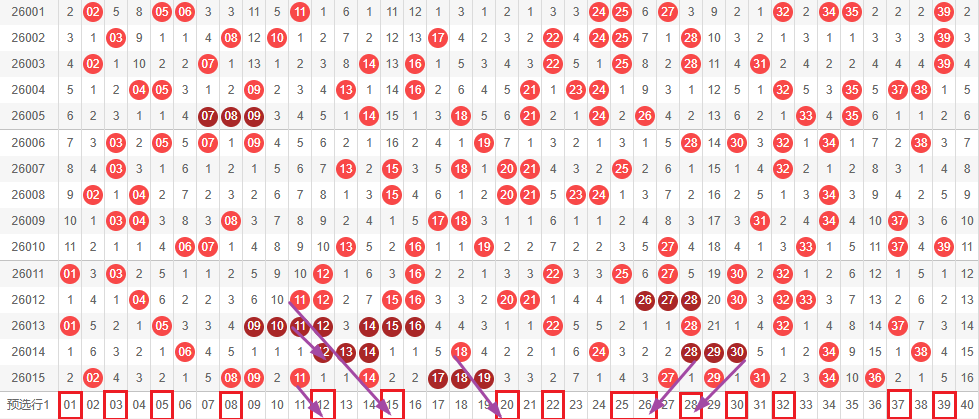 上期前半区开出13个号码,本期应该会延续,所以一区推荐号比较多,01.03.05这三个可以三选一,08上期开出小连号,本期可能会重,12.15.20.22. 2526.这个区域可以选2--3个号码,30.32是斜连,37.39选一即可。