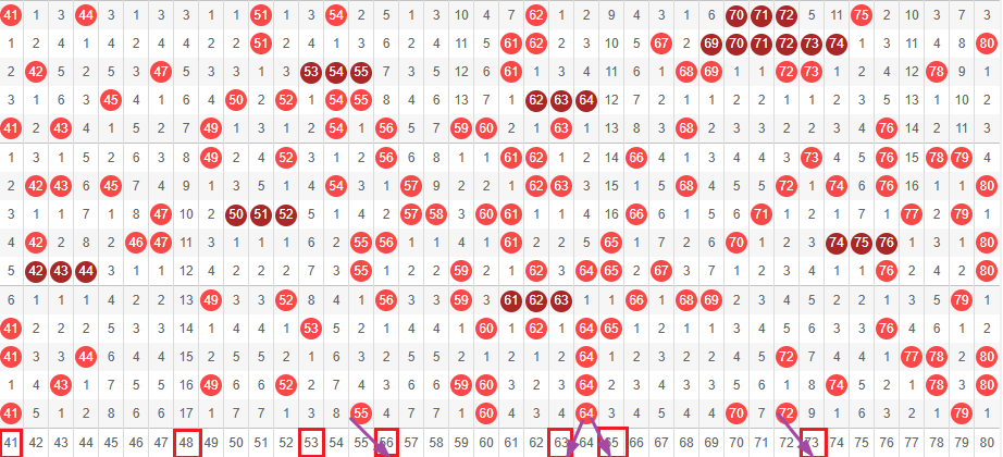 上期尾号3落空,42--54区间落空,本期肯定会回补,接下来我们一起看走势图,我们把01-40分为前区,41-80分为后区。