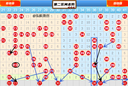 该区间一直是属于中热程度,本期应该还会继续保持现状吧,是可以作战的。上期开出了19 22 25 28号这种空二的连号,那么本期我们要注意一下它们的重号和中间号了,建议重点考虑中间号为主。上期开出了三连号39 40 41,本期出重号的可能性很大,我们要重点关注一下。