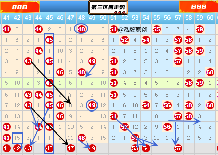 近三期内该区间都是偏冷状态,尤其是上期只开出了3个号码,本期不建议把重心放在该区间。连号44 45在上期没能落号下来,本期我们是需要防守的,很可能会落一码下来。四斜连号54和它的邻号53 55本期也是我们重点考虑的对象,这里应该会有号码出现的。