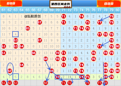 上期在53-70号数字之间断号了,所以本期我们要防守在该区间出现三连号的可能。上期在直播间说过该区间重点看重号就可以了,但是我看的重号是62 69 73 78,上期居然开了74 78 79的重号,又是方向对了,选号出错了,本期的重号可以考虑一下74 75 78号吧,毕竟该区间近期出重号的比例实在是太高了,我们不得不跟随着趋势走。