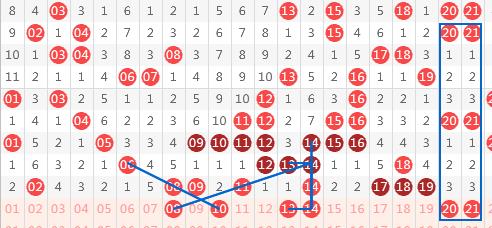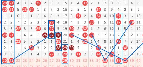 【第二区间21-40】:上期开出5个号码。本期推荐号码:21-29-35-37-38,21为同路形态和等距三期号码,29等距三重号码,35为遗漏10期常见号码,38偶数五期斜连带出37以对子形态回补。二区间推荐重点号码:21-29-38。