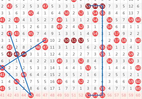 【第三区间41-60】:这个区间上期开出3个号码。本期推荐号码:45-53-54-55,45奇数三斜连,53-54-55则要考虑5字头三连号码周期出号回补和极强的上下对称形态。三区间推荐重点号码:53-54-55。