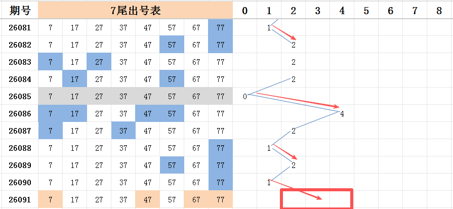 本期看好开出的范围是两码走势至四码走势之间。七尾上期开出一码走势,看好号码77的再次开出,是四连号的号码走势。属于本尾比较有规律的号码走势,如果本尾能开出多码走势,那么有规律的号码大概率会开出。看好两个尾码:号码67和号码77,能够开出其中一码或者两码全开。