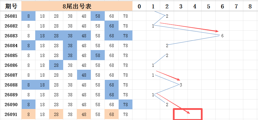 本期看好开出的范围是两码走势至四码走势之间。八尾上期开出两码走势,上期所选的号码,四码中二码,围中选二复式!本期看好重号08的再次开出,看好八尾的号码成有规律的号码排列走势,08-28-48-68。四个号码都属于不同的遗漏走势,符合开出的条件。