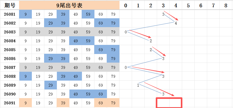 本期看好开出的范围是两码走势至四码走势之间。九尾上期开出一码走势,上期所选的号码,四码中二码,围中选二复式!本期看好两个尾码69和79,能够开出其中一码或者两码全开。前半部分看好号码09和号码39的开出,均是遗漏2期的号码,看好能够开出其中一码或者两码全开。