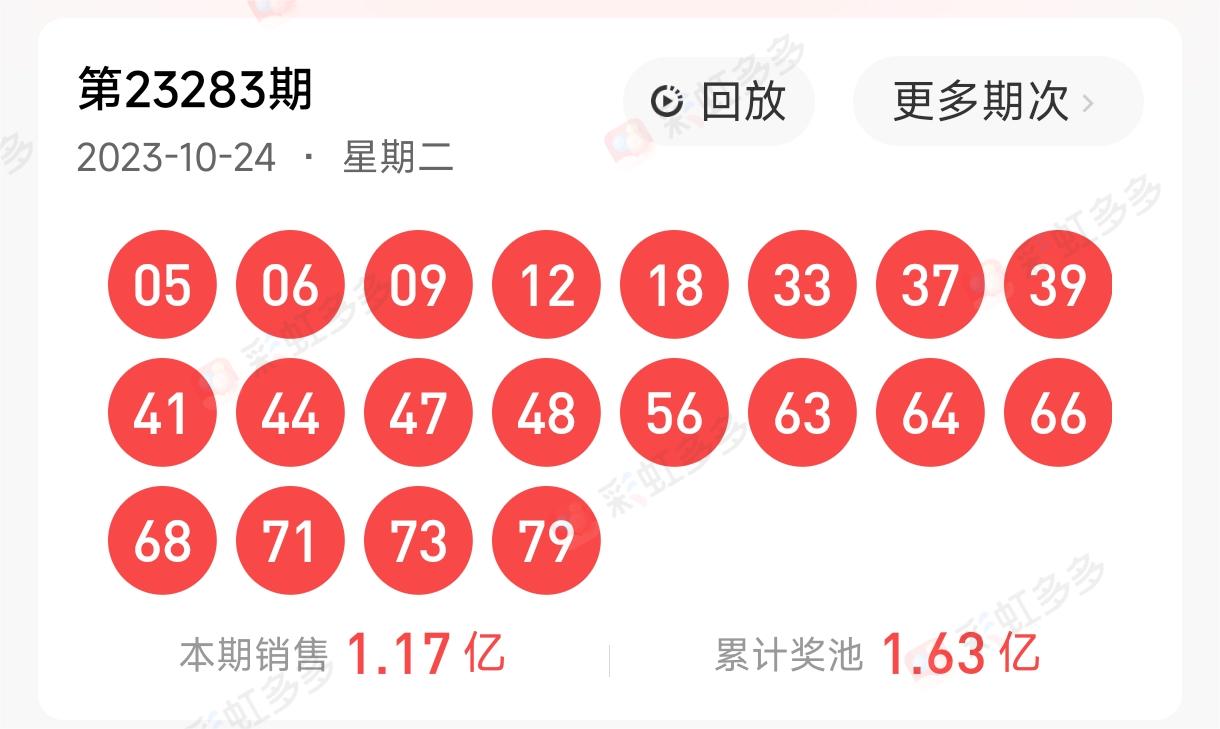 首先回顾上期的开奖号码:05 06 09 12 18 33 37 39 41 44 47 48 56 63 64 66 68 71 73 79