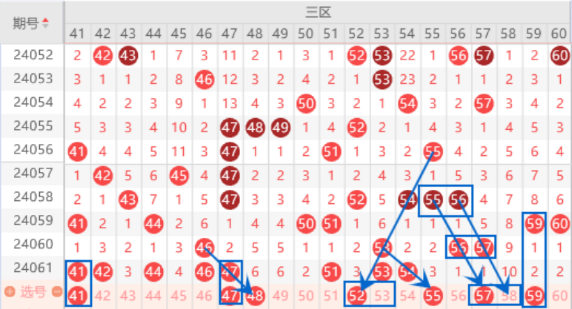 上期开出了41 42 44 46 47号数字,本期我们注意一下出重的情况,重点关注41 47号数字出重的情况就行了。本期的48 49号数字我们注意落下一个号码的情况,做防守就行了。本期的52号数字我们注意一下出号情况,属于四斜连号码,出号机会还是有的。本期的57 58号数字我们注意一下出一个号码的情况,重点关注一下57号数字的出号情况。