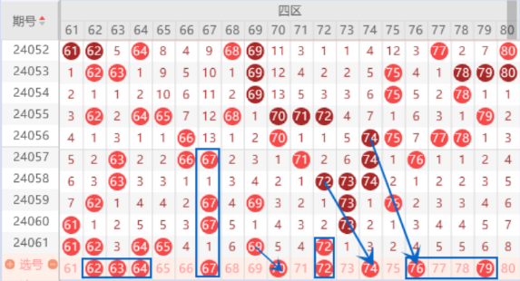上期开出了61 62 64 65号数字,本期我们注意一下出重号的情况,重点关注一下62 64号数字出重就行了,本期的夹号63号数字我们也是要关注一下的。上期开出了69号数字,本期我们注意一下59 79号数字出一个号码的情况。本期的72号数字我们防守一下出重号的情况。本期的74 76号数字我们注意一下出一个号码的情况。