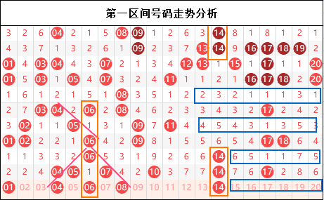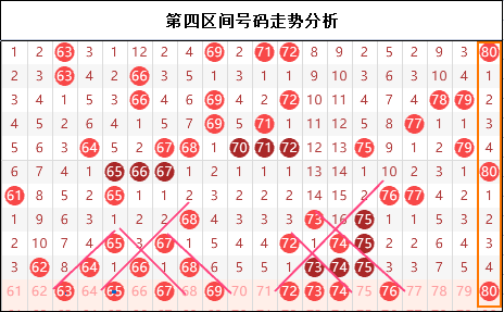 第四区间思路:四区走势有点气人啊,前半部分四码间隔号,后半部分直接开出了三角杀的完美走势,果然还是加奖惹的祸啊。今天的四区才叫一个难啊,纵横交错的走势号码让你眼花缭乱不说,能看见的全是斜连号码。而我们知道斜连号吗是一个处于弱势群体的走势且选择性过多,所以四区倒是希望本期出现断区更符合我们的做号风格。
