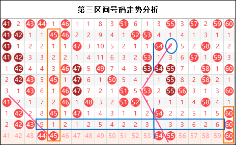 第三区间思路:三区断区这个估计是很多人没有想到的,五字头集体消失,甚至四字头都差点断掉。好在三个号码维持了三个形态,重号续接回来,斜连依旧还有,连号再现。素以本期尽管尽管出现断区,但是整体上似乎三区还是一个值得期待的区间。整个断区的跨度如此之大,而形态上很明显是形成了一拉一斜的走势。但是我们对于这样明显的走势显然是有点担心的,太过于明显了。