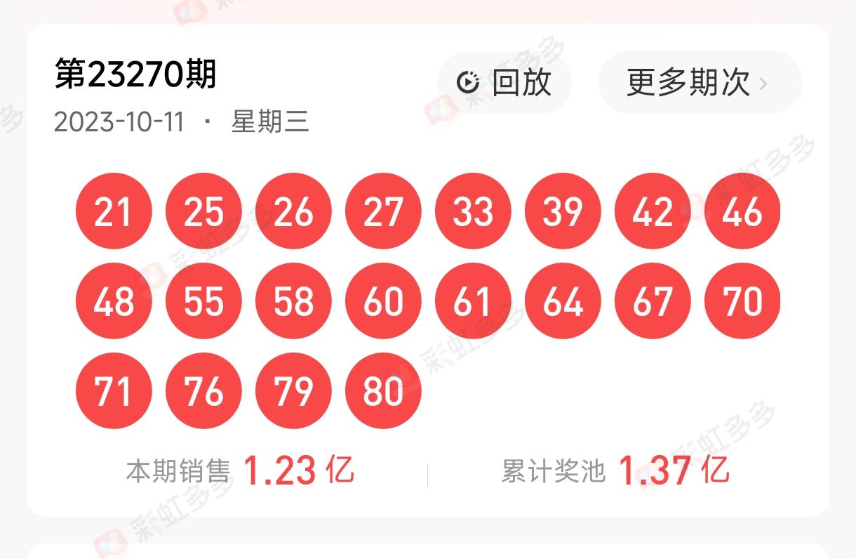 首先回顾上期的开奖号码: 21 25 26 27 33 39 42 46 48 55 58 60 61 64 67 70 71 76 79 80