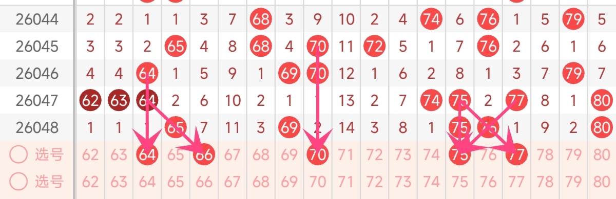 四区号码最大,在开奖中出现的数量相对较少,但一旦出现往往能带来井喷式出号。64、70、75这几个号码在历史开奖中多次出现,可以作为候选号码。而且,四区号码的间隔性较为明显,选择间隔适中的号码组合可能会有不错的效果。而且还需注意其他已经连续多期漏出的号码,本期有几率回补综合考虑,本期四区推荐关注号码:64、66、70、75、77。