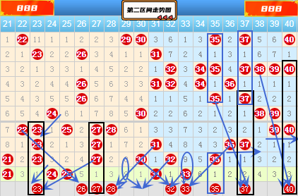 上图中23 27号出号趋势有点类似,本期都是空一期出号类型,这里23号出号趋势比27要明显一点,因为23号和25 27号形成了3斜连。26号是22 23 25的断斜连号,而且它又和27 28号形成三斜连,28号也是30 31的断斜连号,所以可以关注一下,做防守号来用即可。30 32号以31号为中心形成对称,本期这种类型的号码组合仅有这一组,所以这里我们必须要重点作防,说实在的我比较偏向于30号,32号属于夹号类型。上期的夹号31号已经开出来了,所以本期的夹号32号我们就暂时不考虑了。上期的33 44号这个组合两个号码都出号了,本期我们可以防一手它俩继续出号。再来看连号36 37号同时遗漏2期,39 40号同时遗漏3期,按照以往的出号趋势,这四个号码里应该是要落号下来的。37号和35 36号形成三斜连且又是空二对称类型,40号和38 39号形成三斜连且又是空三对称类型,所以这里我们就重点参考37 40号即可。