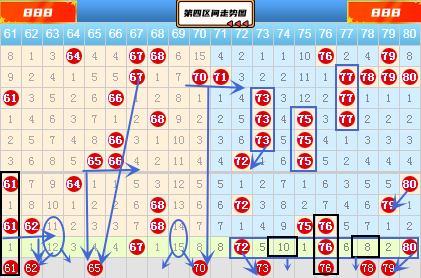 在该区间有同期遗漏值连号61 62号同时遗漏1期、连号65 66号同时遗漏4期、连号70 71号同时遗漏8期,这些号码中本期是要落号下来的。61号属于空一对称类型,这种对称类型也是经常开出来的,62号属于冷号63号的邻号,也是要防守的,65号和66 67号形成大长三斜连,可以留后考虑,66号没有太明显的出号趋势,暂时放弃。70 71属于小冷号而且70号又是大冷号69号的邻号,所以要重点关注。及这些数字中我们要重点关注61 62 70号数字的出号情况。上期在71-80号数字中开出了72 76 80号数字属于空三类型出号,那么本期该处的空三中心号74 78号我们就药重点关注了。以前的文章中就说过73 76 78 80号是一种组合类型,上期既然开了76 80号数字,所以本期的73 78号我们就要注意了,所以这里的78号数字还是很看好的。空三中间数73 75 77 79号,75号没有太明显的出号趋势,暂时放弃,77号虽然和75 76号形成了三斜连,但是也不是太看好,79号有前面的79 80号做铺垫,可以留下做参考。所以在该区域我们重点参考73 78 79号数字的出号情况。好了,本期分析就到这里吧。