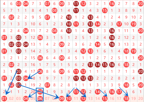该区间的01号数字我们要注意一下,01 02 03斜连对称,出号机会还是有的。本期的06号数字我们要注意走重情况的。本期的08 09 10号数字我们要注意出二连的情况,重点关注一下09 10连号的出号情况。上期开出了11 14 17号数字,那么本期我们就要注意10 13 16同时出的情况,或者看12 15 18同时出的情况,这里出一个重号的机会的和出一个夹号还是有机会的,所以我们可以防守一下。