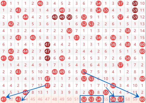 该区间的41号数字我们可以注意一下,是属于复制号码,可以关注一下。上期开出了44号数字,本期我们要注意一下它分边的情况,走重的机会还是有的,所以我们可以注意一下43 44同出的情况。上期开出了53号数字,本期我们也是要注意分边的情况,尤其是54号数字就像上期的62号数字。本期的56号数字我们也是可以关注一下,出号机会还是有的。