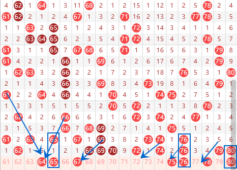 该区间的64号数子我们可以关注一下,他是属于斜5连号,又是夹号回补号码,出号机会还是有的。本期的65 67我们要注意出一个号码的情况,都是空7空1走势,有机会出一个的。本期的71 73 75我们也是要注意出一个号码的情况的,重点考虑一下78号数的出号情况。本期的74 76我们也是要注意出一个三重的情况。上期开出了79 80,本期我们要注意走重的情况。