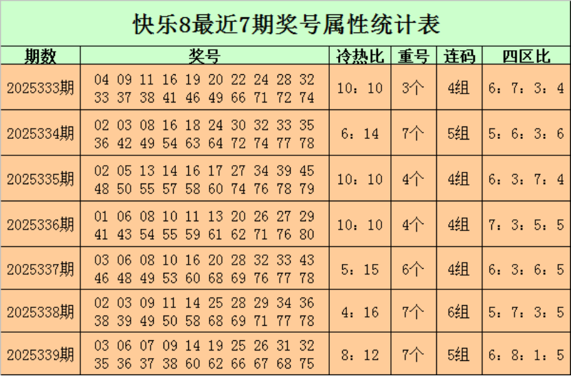 福彩快乐82025339期开奖回顾:03 06 07 09 14 19 25 26 31 32 35 36 37 38 60 62 66 67 68 75,其中奖号冷热比为812,开出7个重号:03091425363868,四区比为6815