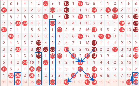 上期开出了连号02 03,本期我们要注意出重的情况,重点关注一下03号数字走重的情况。本期的08 09号数字都空三对称号码,本期我们要注意落下一个号码的情况。本期的10 14号数字都是断V型号码,我们要注意出一个号码的情况,而且11 13 14有是连号空一带号,也是有出重的机会的,所以我们可以重点关注一下14号数字的出号情况。本期的19号数字我们可以防守一下,毕竟上期开出了20号数字,本期的19 20 21刚好形成三斜连号码。