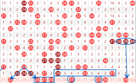 上期开出了23 24 25连号,本期不一定会落下重号来,所以我们要注意一下边号22 26的出号情况,重点关注一下26号数字的出号情况。本期的26 28都是属于夹号,这里也是要出一个号码的,我们要注意一下。本期的31 35都是空三中心号,本期的空三中心号有4个,本期最少是要出一个号码的,我们可以重点关注一下31 35的出号情况。连号38 39 40本期我们也是要注意落下号码的情况,重点关注一下39号数字的出号情况。