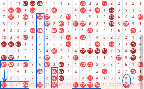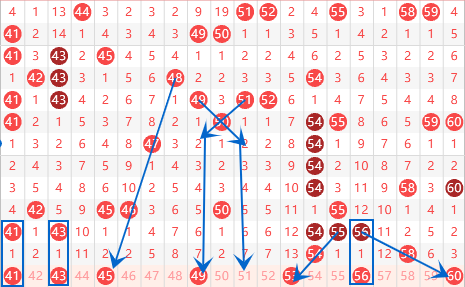 本期的41 43我们要注意出一个号码的情况,可以挑一码防守一下。本期的45号数字我们也是需要防守一下的,它是属于斜四连号码。本期的49 51 52我们还是需要注意一下,连号51 52同时遗漏7期了,本期我们在放一期,等到遗漏8后在来做号,所以这里我们就重点关注一下49号数字就可以了。上期开出了58号数字,本期的59号数字我们也是要关注一下,毕竟上期开出了69号数字,所以本期59 79号数字还是有机会出一个的。
