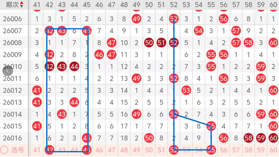 第三区间的走势分析:第三区间上期开出了六个号码球,主要的落号点位在三区间的后半区,走出了两奇四偶的形态走势,上期三区间的前半区落下了两个号码球,后半区落下了四个号码球,整个三区间处于走热的趋势,根据三区间的走势规律,今天的三区间我们主看前半区42 45的组合,冷码42的回补,45走出重码,再看后半区52 55组合的落位,热码52继续落下,以及55的回掏,这四个号球建议大家打个四胆小拖,或者打个四码复三比较稳妥,参考为主!