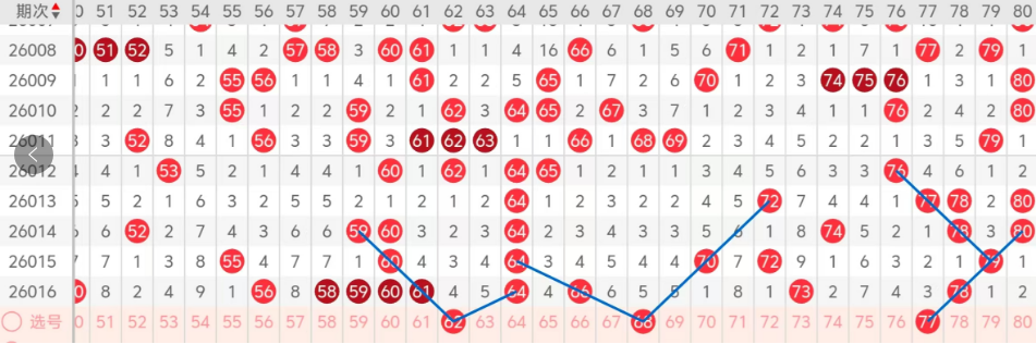 第四区间的走势分析:第四区间上期开出了五个号码球,主要的落号点位在四区间的前后半区,走出两奇三偶了的形态走势,上期四区间的前半区落下了三个号码球,后半区落下了两个号码球,整个四区间处于走温的趋势,根据四区间的走势规律,今天的四区间我们主看边码62的落位,也是热码的回补,再看68 77这两个号码球的落位,主看77这个号码球的落位,以及62 68的组合,都走出了斜连码的走势形态,这三个号球建议大家打个三胆拖,或者打个三码复二比较稳妥,参考为主!