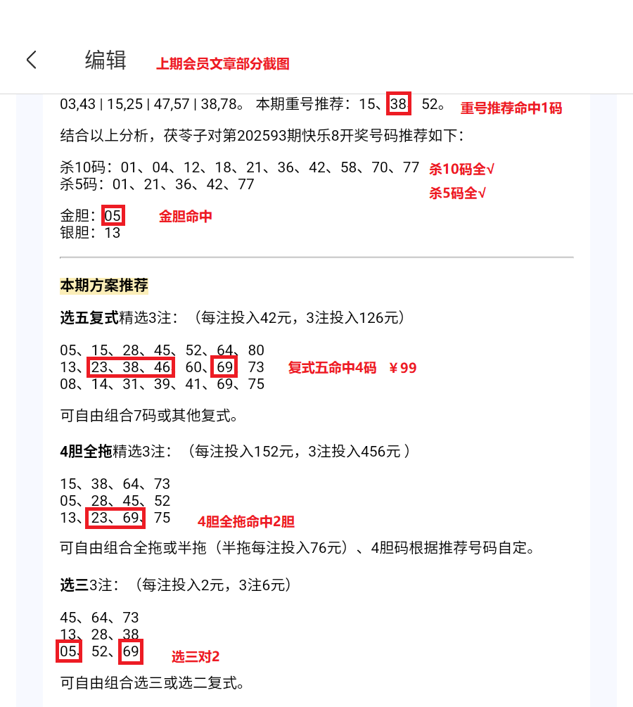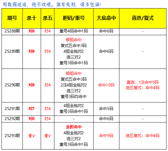 上期杀10码全对,免费文章杀5码全对。金胆命中,4胆全拖对2,选三对2,重号3码命中1码。