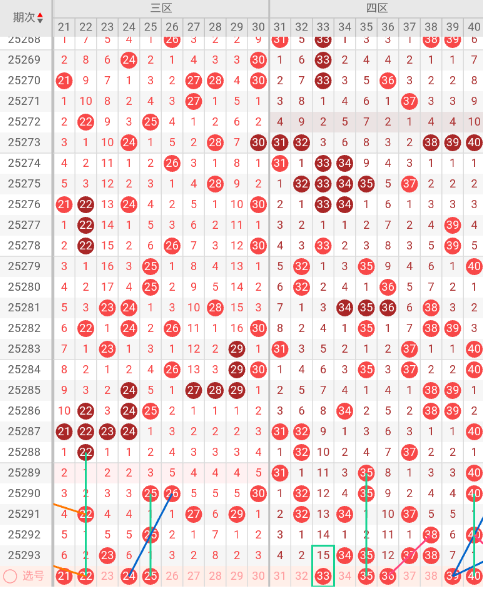 四区开出:34,35,37,38 奇偶比: 2:2 和值:144 跨度:4,上期开出4个号码,奇偶数号码均衡。本期三斜连走势:36,隔码斜连走势:39,近10期平均出号2.8枚。本期推荐关注号码:33、35、39、40。