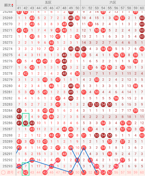五区开出:41,46 奇偶比: 1:1 和值:87 跨度:5,上期开出2个号码,奇偶数号码均衡。本期三斜连走势:42 45,隔码斜连走势:49。近10期平均出2.8枚,本期推荐关注号码:42、45、49。