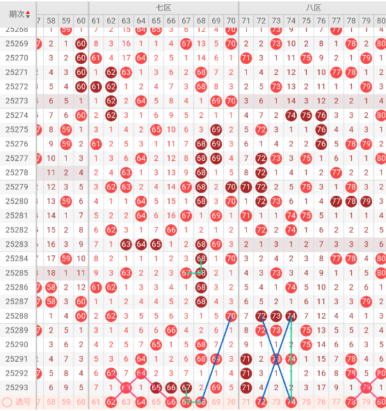 八区开出:71,79 奇偶比: 2:0 和值:150 跨度:8,上期开出2个号码,奇数号码占优势。本期三斜连走势:78 80,隔码斜连走势:72 74。近10期平均出号2.3枚,推荐关注号码:72、74、78、80。