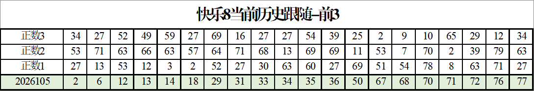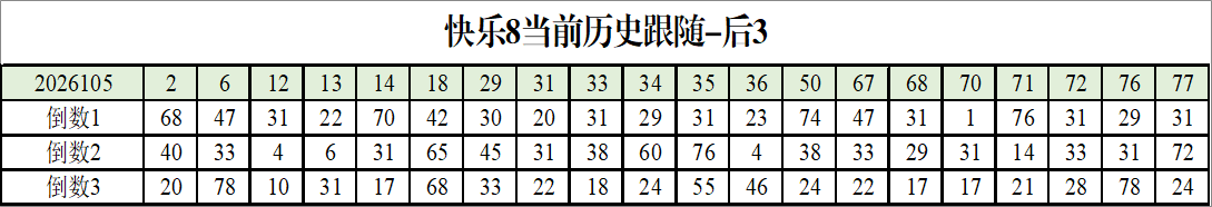 我感觉选热的同时,还要注意防冷条件开出,可以直接选取每个号码跟随出次前三的号码,也可以考虑把出次最后的三个数字加进去,不过这样可能号码太多,可以尝试。图上也能看出单独号码跟随的情况,我就不一一统计每个号码的出次了,我这里考虑提高概率,取每个号码历史跟随的前三号码和后三号码,根据2026105期的号码,我关注正数3和倒数3的号码号码为: