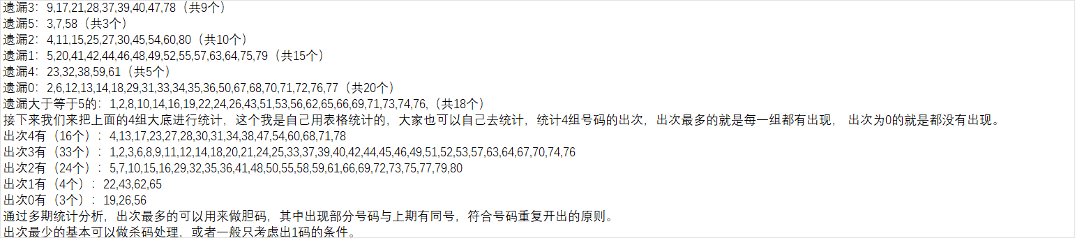 如果把对数和补数合起来有40个号码,中间可能还会产生一下重复数,通过近几期的统计分析,以上期数据进行补数对数计算推算下一期的概率不高。为提高概率,我主要是用前两期的数据来进行对数补数推算,然后再组成一个集合,作为我的第四组大底号码。