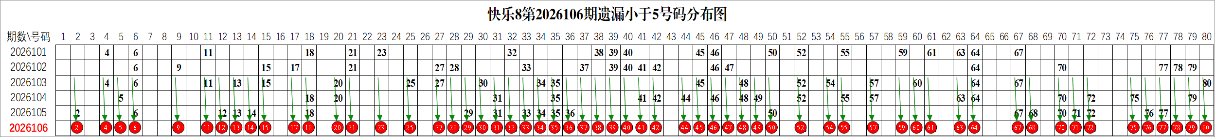 所以这个条件值得关注,从号码分布图上我们可以分析出,遗漏小于5期的号码有: