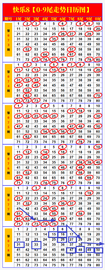 本期画线思路概括:大家现在对尾号走势图有没有新的认识和了解呢,我现在对于快乐8的研究,目前主要集中在尾号和四分区上,其他基本不怎么关注了。我做这个图的初心,也是当初发现很多开奖号码都是以同尾的形式出现,多的时候甚至能达到六七个同尾号。本期我还是先定尾,看好的是6/7尾,根据6尾延伸出整体的框架思路,如我上面标记的那样。