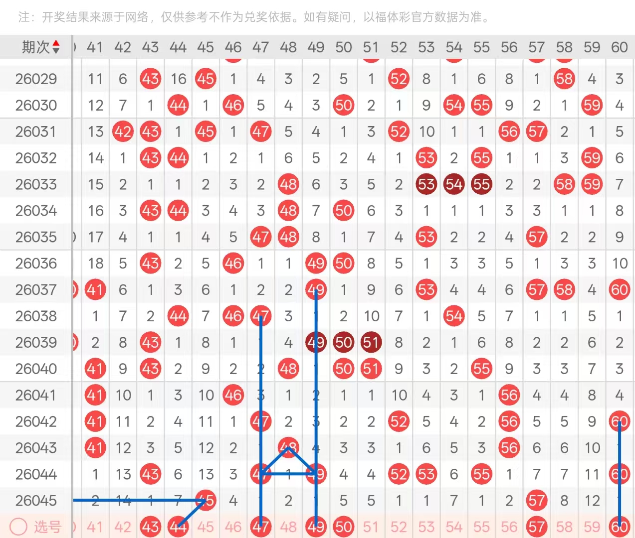三区:三区间上期只开出两码,四字头仅开出中部位置十三期遗漏下落的45,以估码形态开出,头部位置以及尾部位置均处于放空状态。五字头开出尾部位置七期遗漏下落的57,以估码形态开出,前端部分一码没开出,处于放空状态。本期四字头头部位置可优先考虑41的上下遗漏对称空2回补,其次42与44两码在本期防守同开,45的估码在本期防守做重即可。其次4557中间属于大跨,四七四九五二五三五十五五码空1回补可做1~2码即可。其次55一两码空5回补做一码下落。五字头在本期可优先考虑五十四五十三两码的下落。其次尾部位置57的孤码分边,5658做二选一,5960防守即可。