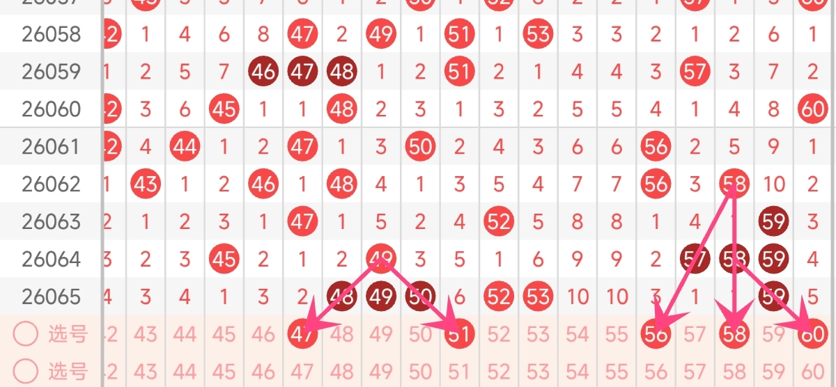 三区的情况也有其独特之处。三区号码的分布相对较为分散,变化较为频繁。但在近期的开奖中,47、56、58等号码出现的次数相对较多,可视为热号。而41、60等号码则较少出现。在三区选号时,可以综合考虑热号和冷号的组合。而且还需注意其他已经连续多期漏出的号码,本期有几率回补综合考虑,本期三区推荐关注号码: 47、51、56、58、60