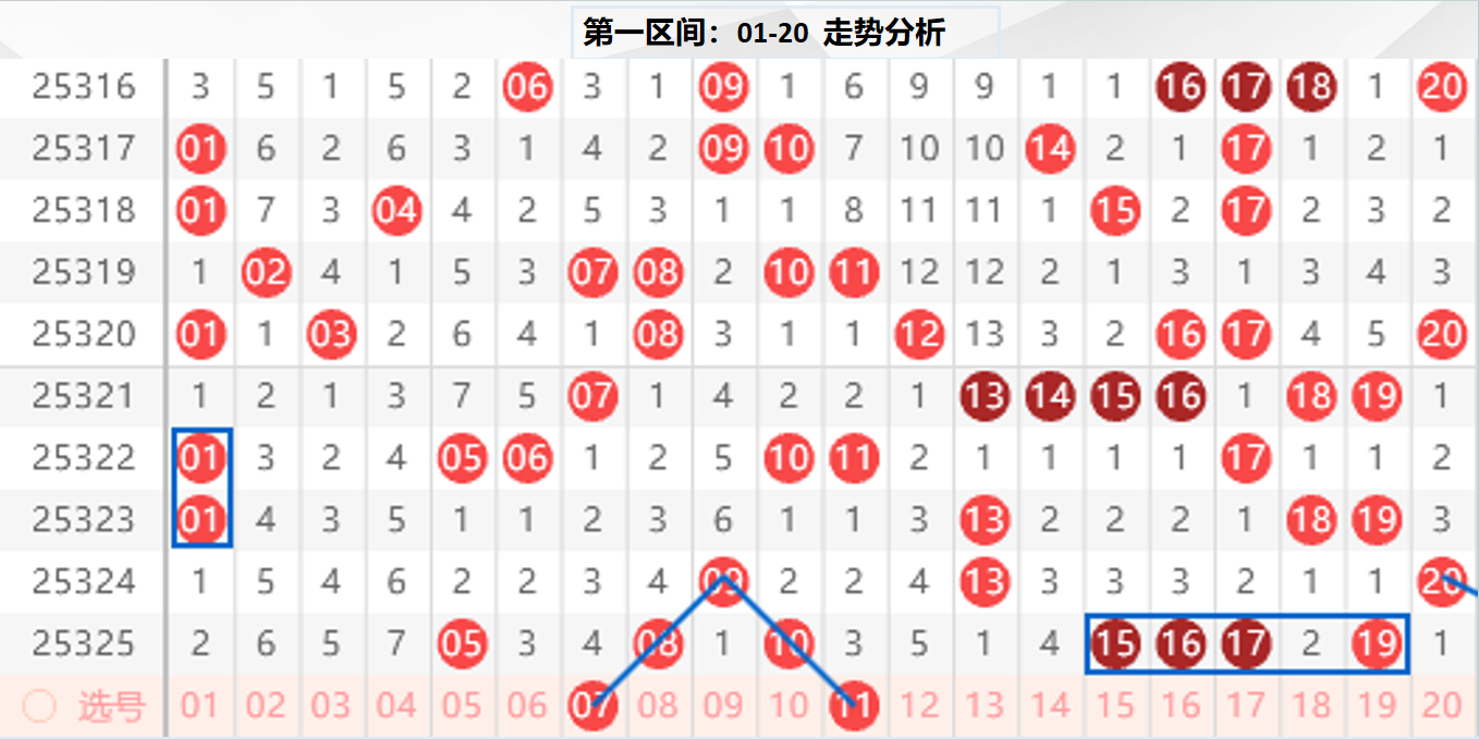一区分析:【01-20】(走势图标注号码非小黄车大底,请谨慎参考,具体思路将在直播间分享讨论)