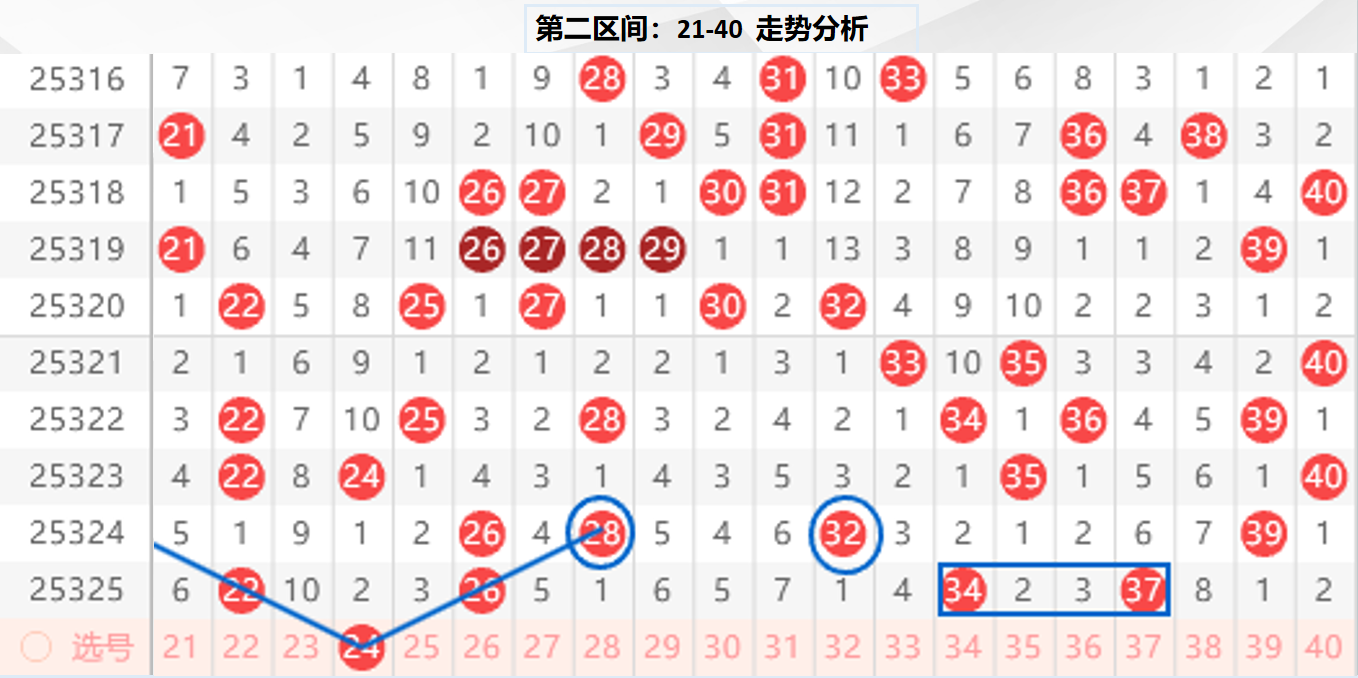 二区分析:【21-40】(走势图标注号码非小黄车大底,请谨慎参考,具体思路将在直播间分享讨论)