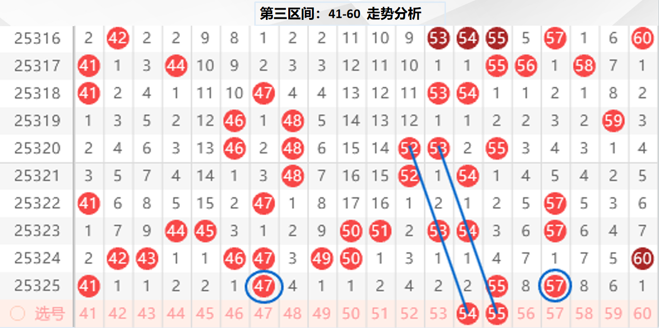 三区分析:【41-60】(走势图标注号码非小黄车大底,请谨慎参考,具体思路将在直播间分享讨论)